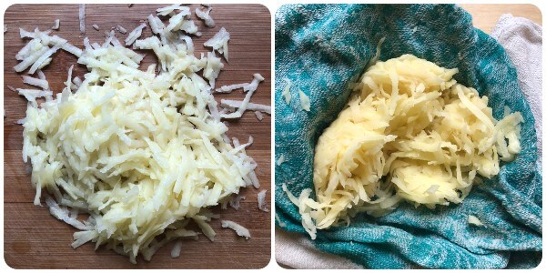 Pela la patata, lávala, sécala y rállala en juliana con el mismo rallador. Luego ponla en un paño de cocina y exprímela bien para eliminar todo el exceso de agua.
