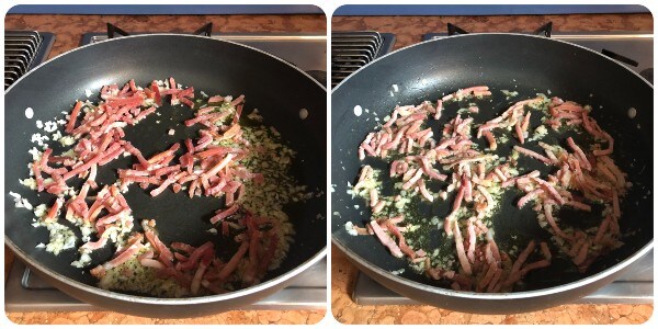 En una sartén grande, calentar un poco de aceite y sofreír la chalota y los bastones de speck, dejándolos freír durante unos minutos.