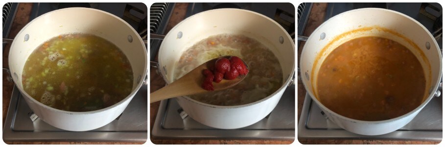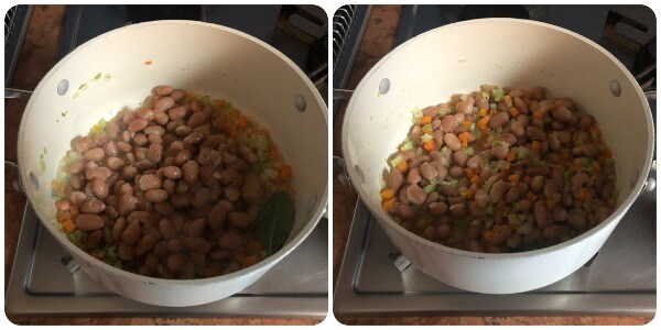 En este punto, cubrir las judías con el caldo hirviendo, añadir una cucharada de concentrado de tomate, bajar el fuego y cocinar durante unos veinte minutos sin tapa, removiendo de vez en cuando. Añade más caldo si el de la cazuela se seca demasiado.