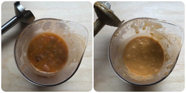 Al terminar la cocción, extraer la mitad de la sopa, colocarla en el vaso de una batidora de inmersión y triturarla.