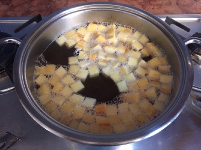 Sacar del horno y dejar enfriar la pasta, luego transferirla a una tabla de cortar y cortarla en cubos.