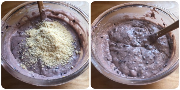 Luego añade de una vez la harina de almendras y mezcla.