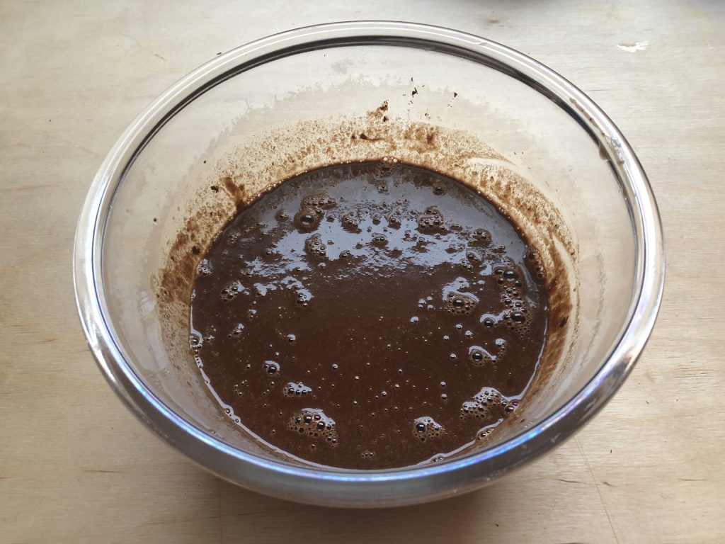 Mezclar bien con un batidor de mano pequeño, luego verter sobre la mezcla el agua caliente y amalgamar todo.
