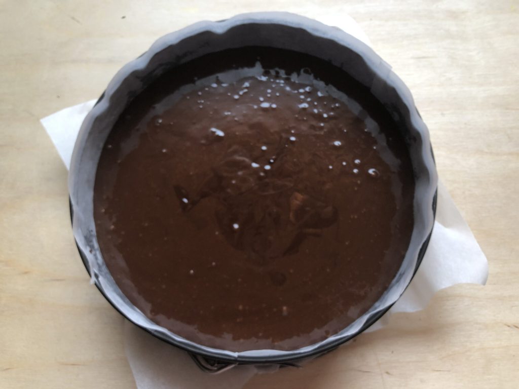 Verter la mezcla obtenida en un molde de 22 cm de diámetro previamente forrado con papel de horno.