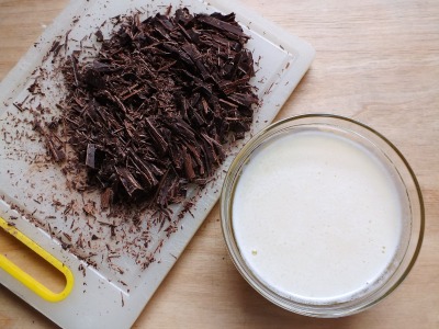 Con un cuchillo, reducir el chocolate en trozos gruesos y reservarlos.