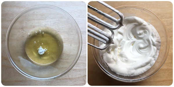 Añade a las claras una pizca de cremor tártaro y móntalas a punto de nieve con las varillas eléctricas. Reserva. Leed AQUÍ para saber cómo sustituir el cremor tártaro si no lo encontráis, pero sobre todo para entender exactamente para qué sirve. Hoy en día se encuentra en todos los supermercados, normalmente en la sección de preparados para repostería pero, si no lo encontráis, podéis comprarlo online haciendo clic AQUÍ.
