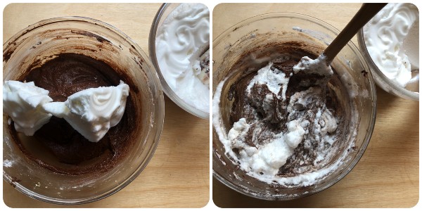 Es el momento de añadir las claras montadas: incorpóralas gradualmente con movimientos suaves de abajo hacia arriba para evitar que se bajen.