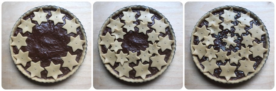 La he llamado tarta de Navidad porque la he hecho con una masa quebrada especiada y la he decorado con estrellitas y confetis plateados. Sin embargo, se puede presentar de mil maneras diferentes. Y es lo que haré seguramente porque es una pena poder comerla solo en el periodo de las fiestas. Bastará con hacerla con una masa quebrada normal y cubrirla con el clásico motivo de rombos para poderla servir todo el año. Fantástico el relleno que recuerda mucho a un pudin y que permanece suave y húmedo. En resumen, una tarta que me ha gustado muchísimo y, por la velocidad con la que ha desaparecido, he deducido que ha gustado muchísimo a todos. Pero tiene un lado negativo: hay que consumirla rápidamente en uno, máximo dos días porque el relleno tiende a ablandar las estrellas que pierden su crocancia. No os queda más que probarla y decirme qué pensáis.