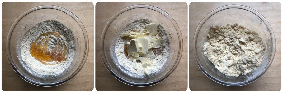 Luego, añadir la miel y la mantequilla fría y amasar rápidamente los ingredientes con la yema de los dedos tratando de impregnar la mantequilla con los polvos. Se obtendrá una mezcla bastante arenosa.