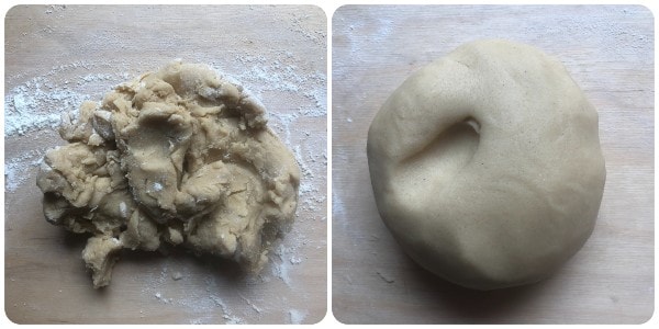 Transferir la masa a la superficie de trabajo ligeramente enharinada, trabajarla unos instantes con las manos hasta obtener una masa lisa y homogénea. Si resulta demasiado blanda, añadir un poco más de harina.