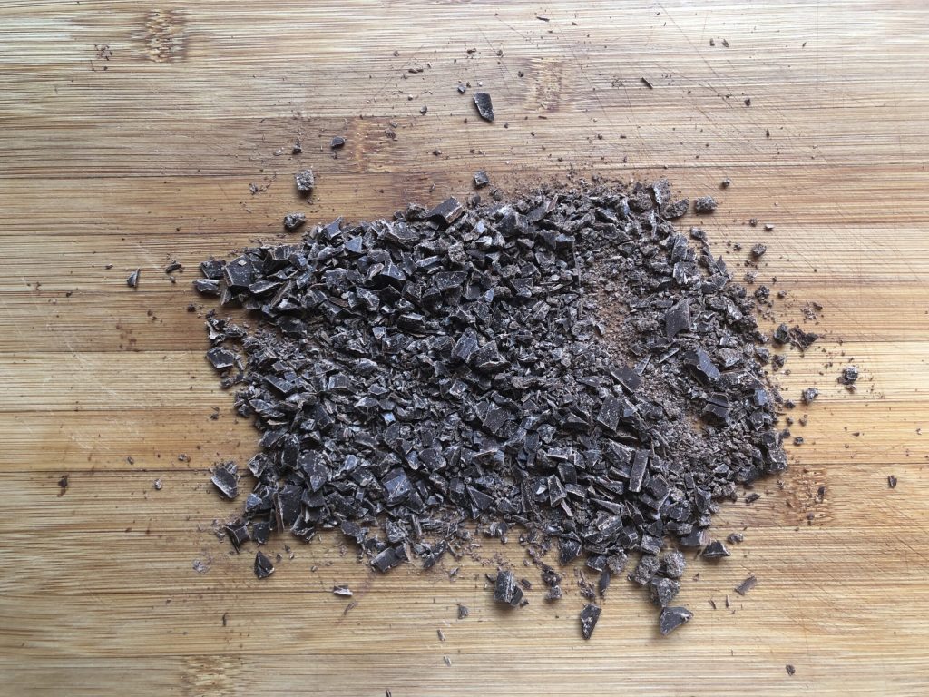 Con un cuchillo, reducir el chocolate negro en virutas no muy grandes.