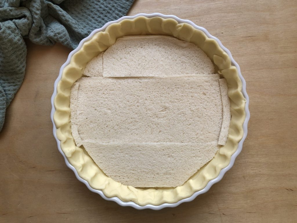 En este punto, cortar a medida las rebanadas de pan de molde y colocarlas sobre la base de hojaldre. Darán una perfecta consistencia a todo el conjunto.