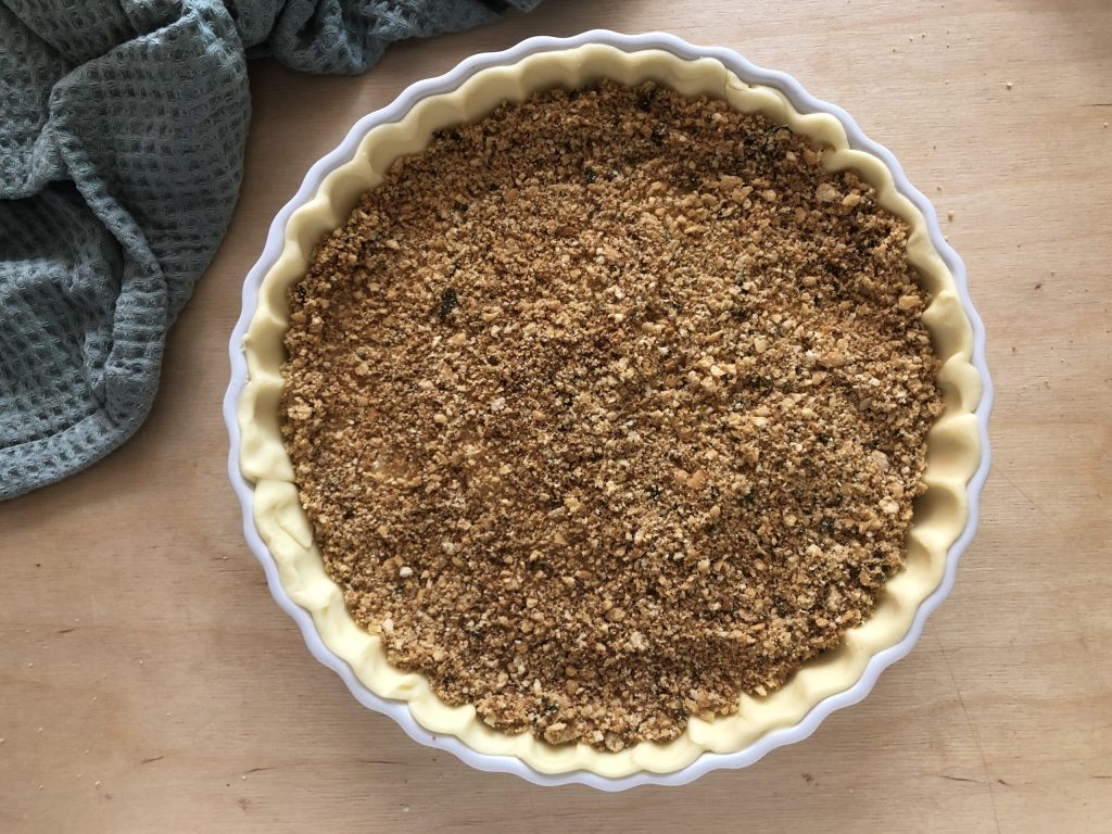 Pincelar un molde (o fuente) para tartas de 22 cm de diámetro con un poco de aceite y espolvorearlo con una capa fina de pan rallado.