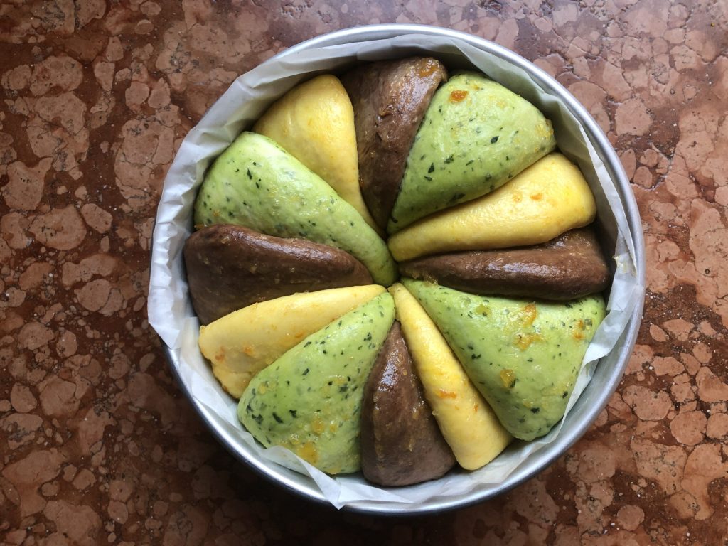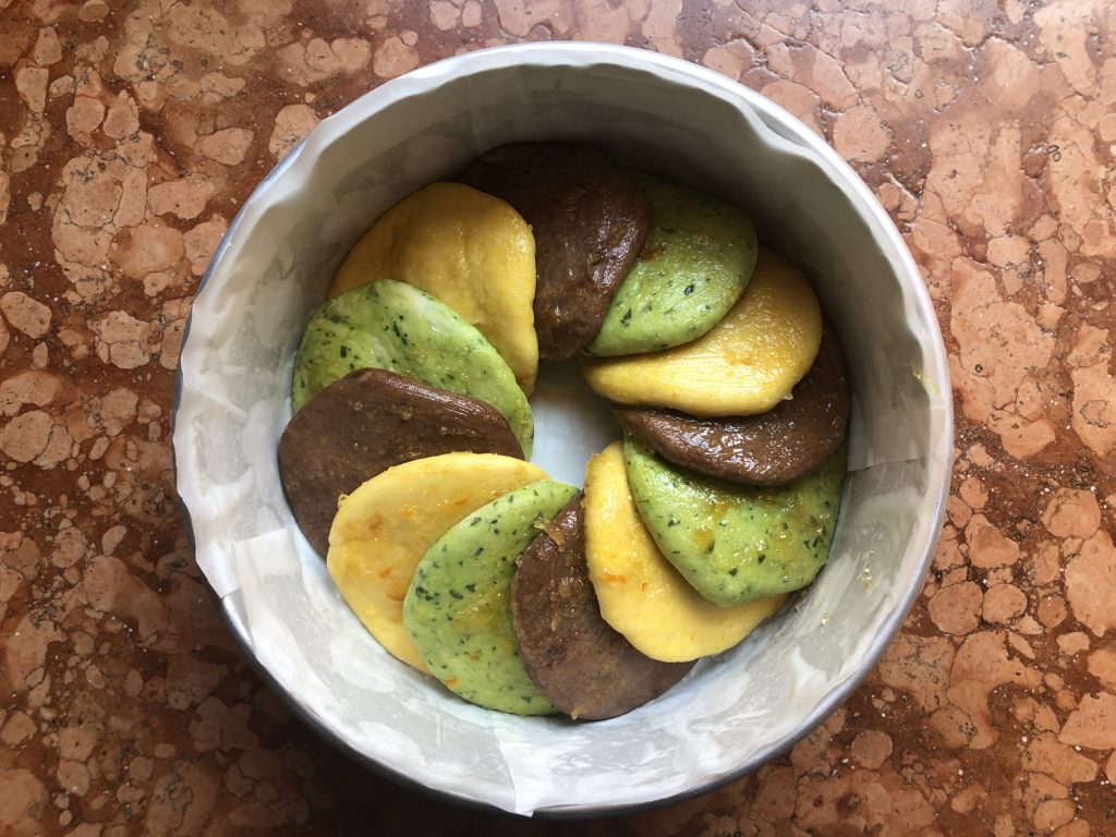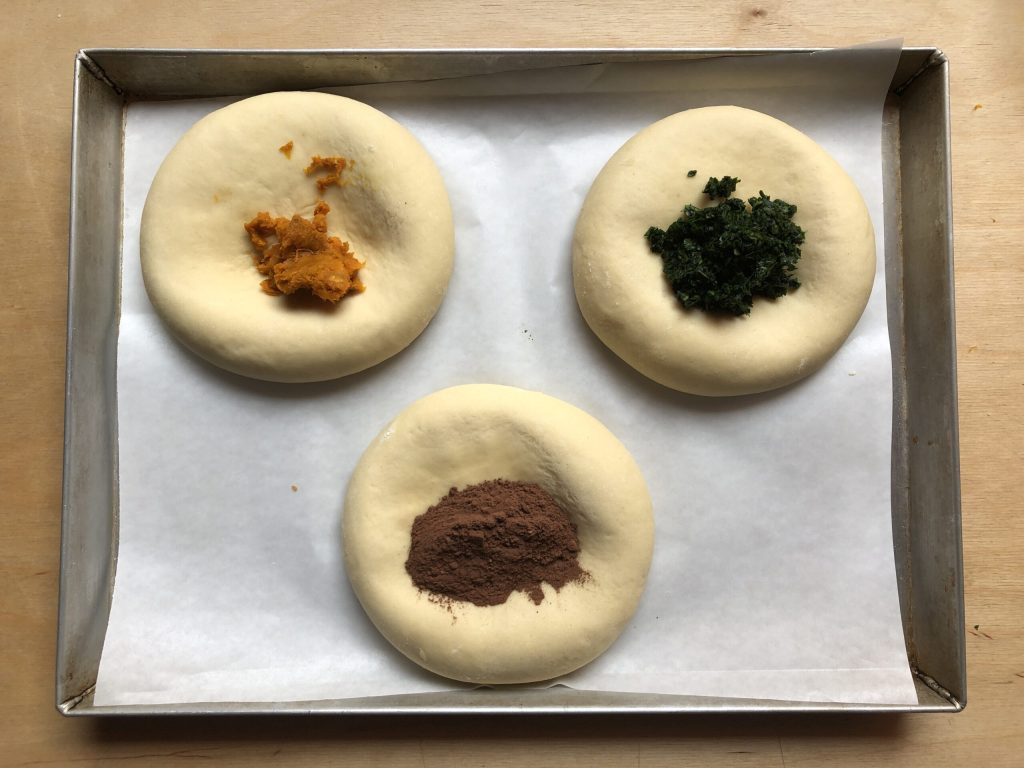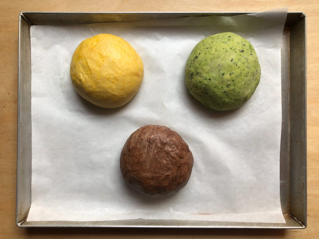 • Pasada la hora de reposo, romper la fermentación y añadir el puré de calabaza, las espinacas picadas y el cacao en sus respectivas masas. Probablemente será necesario añadir una cucharada de leche a la masa marrón. Servirá, en cambio, un poco de harina (pero poca) en las otras dos masas.