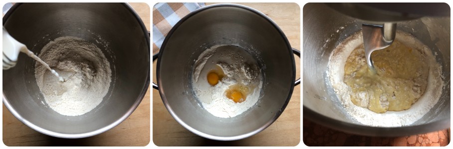 • Luego, añadir la leche tibia y los huevos y empezar a amasar con el gancho amasador.
