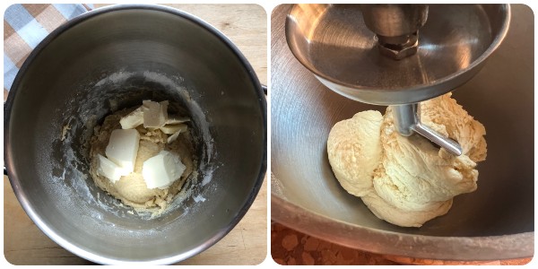 • Cuando la masa se haya compactado, añadir la mantequilla blanda en trozos y seguir trabajando con el gancho hasta obtener una masa lisa y homogénea.