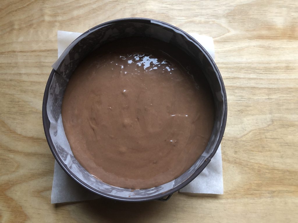 Verter la masa obtenida en un molde de 22 cm de diámetro previamente revestido con papel de horno y nivelarla con una espátula.