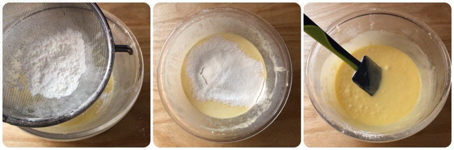 En este punto, incorporar la fécula tamizándola a través de un colador de malla fina y mezclando con una espátula.