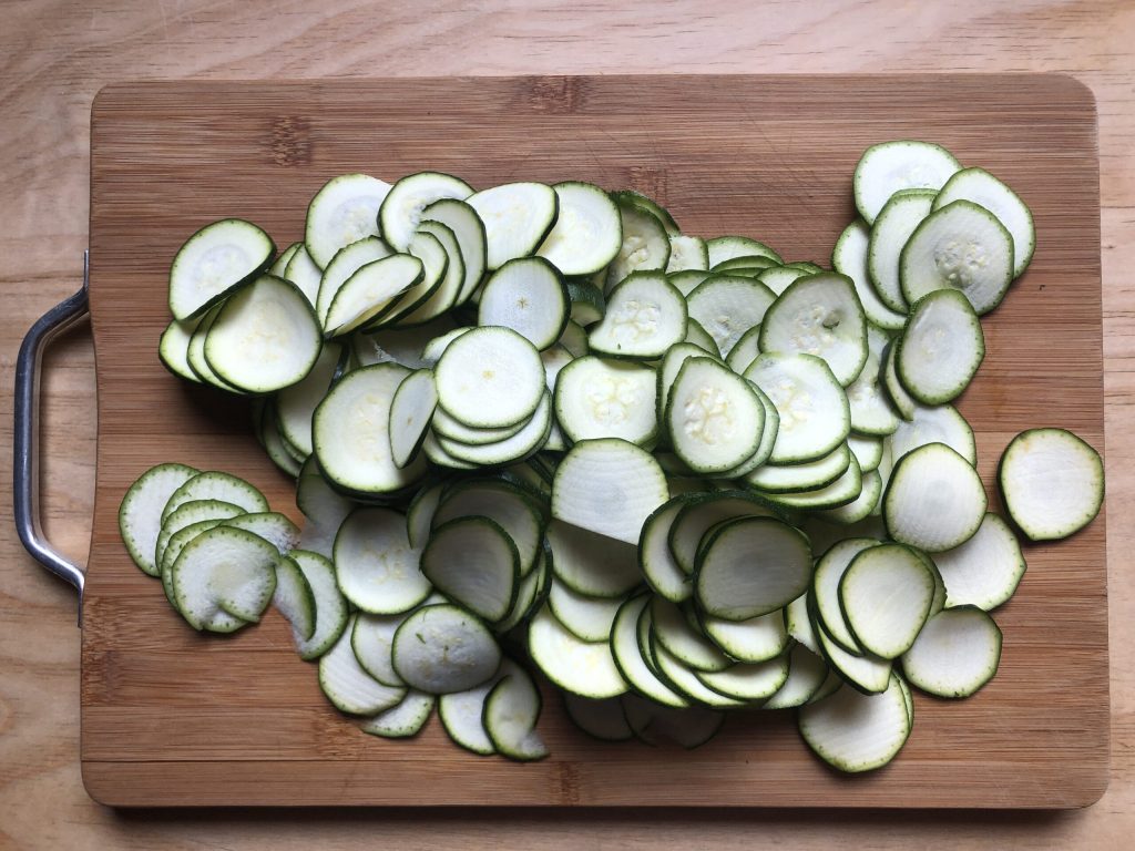 Cortar los extremos de los calabacines, lavarlos y cortarlos en rodajas finas con una mandolina.