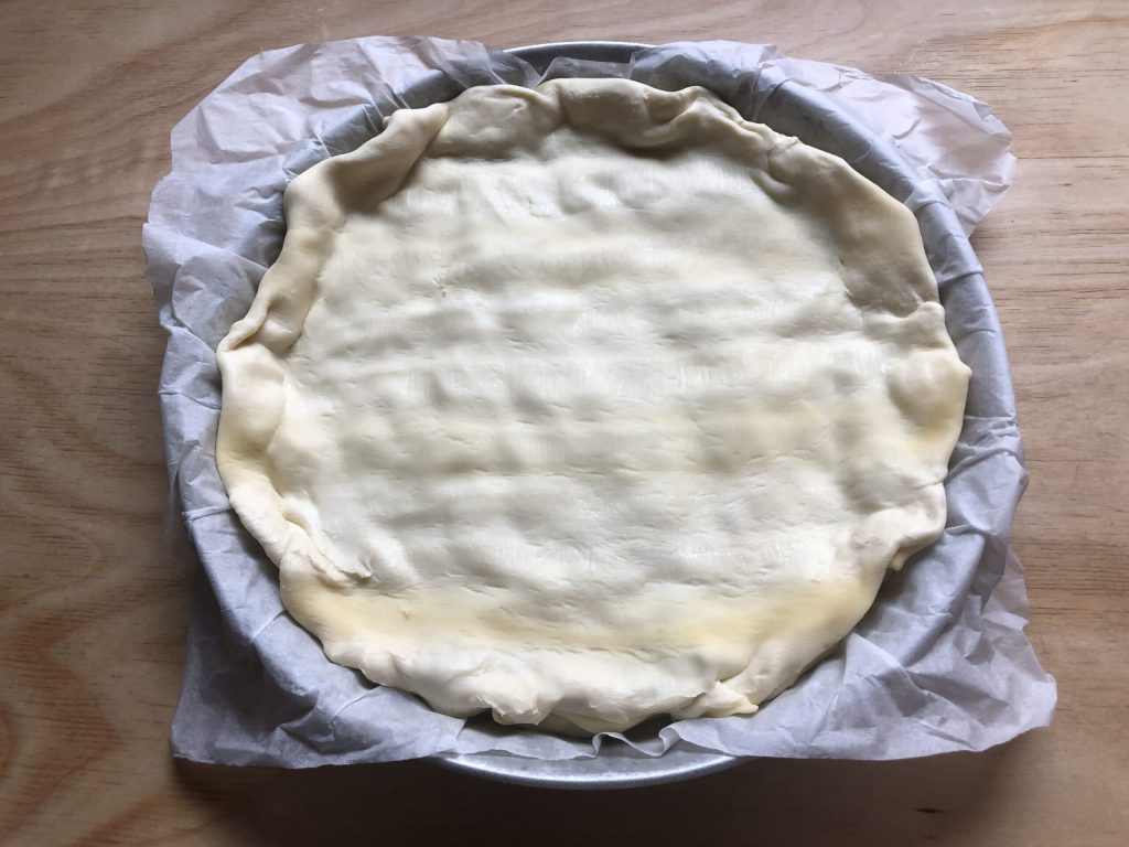 Forrar un molde para tarta de 28 cm de diámetro con el primer disco de masa de hojaldre, dejándolo sobre el papel de horno proporcionado en el paquete y pinchar el fondo con los dientes de un tenedor.