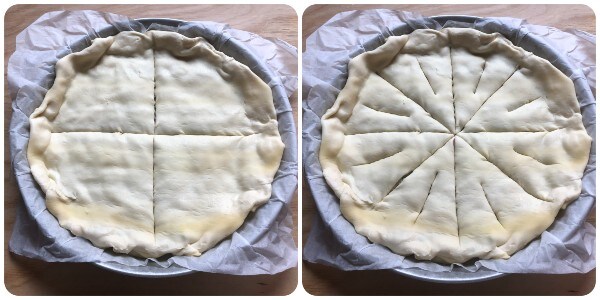Con un cuchillo afilado, marcar la superficie como se muestra en las fotografías: debes obtener ocho porciones. Hacer un pequeño corte dentro de cada porción.
