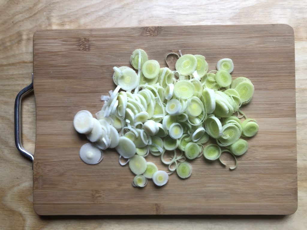 • Limpia los puerros eliminando las raíces, la capa exterior y la parte verde más oscura. Lávalos y córtalos en rodajas finas.