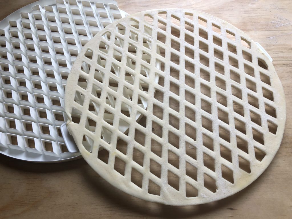 • Ahora, sosteniendo la rejilla por los dos extremos, golpéala ligeramente sobre la superficie de trabajo para que caigan todos los trozos cortados. Empuja con la punta de un cuchillo los que no se desprenden solos.