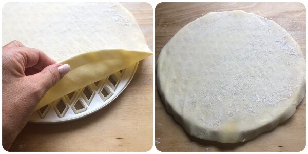 Para realizar la cobertura de esta tarta salada he utilizado una rejilla para tartas. Obviamente, este no es un paso obligatorio. Puedes decidir cerrar la tarta salada con un segundo disco de hojaldre entero o preparar tiras y crear una superficie de rombos similar a la clásica tarta de mermelada. Como alternativa, también podrías decidir no cerrar la tarta. En este caso, simplemente dobla los bordes del disco inferior sobre el relleno.