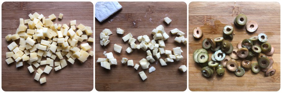 • Mientras tanto, corta el queso fontina en dados, el queso brie en pedazos después de quitarle la corteza y las aceitunas en rodajas.