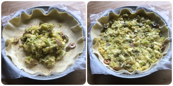 • Cuando los puerros estén ya tibios, añade el huevo, el queso rallado, el fontina, el brie y las aceitunas verdes. Condimenta con sal y pimienta al gusto y mezcla bien para amalgamar todos los ingredientes.