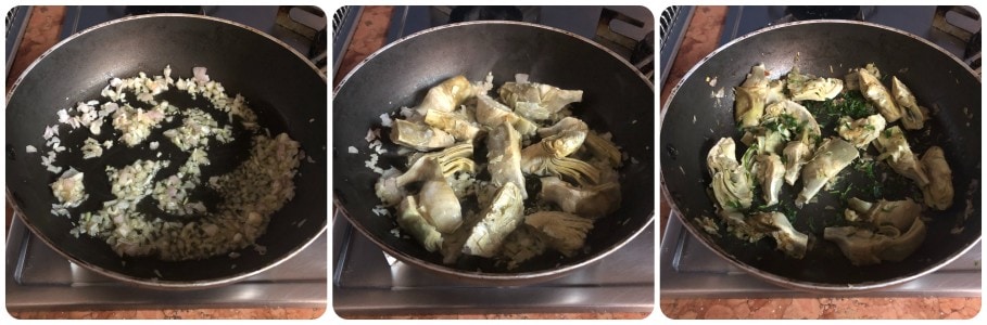 En una sartén, calentar algunas cucharadas de aceite y dorar la chalota. Luego añadir los corazones de alcachofa aún congelados, salar al gusto y cocinarlos durante unos diez minutos a fuego lento, removiéndolos a menudo. Al finalizar la cocción, aromatizarlos con perejil picado finamente.