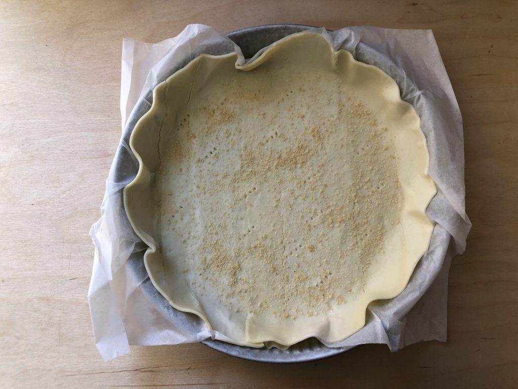 Cubrir con la masa brisé un molde de 26/28 cm de diámetro utilizando el papel de horno que viene en el paquete. Pinchar el fondo con los dientes de un tenedor y espolvorearlo con pan rallado.