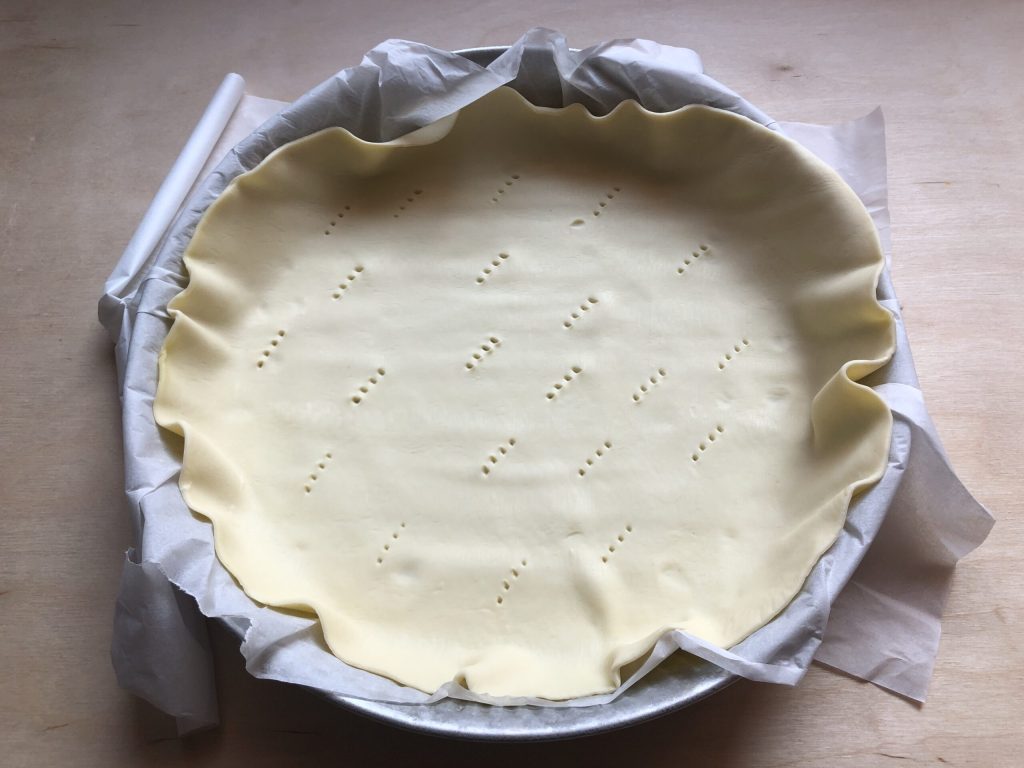 Desenrollar el segundo disco de masa de hojaldre y colocarlo dentro de un molde de 26/28 cm de diámetro sin quitarlo del papel de horno. Pinchar el fondo con los dientes de un tenedor.