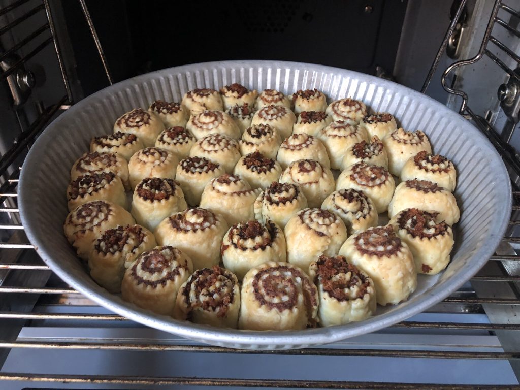 En este punto, enrollar cada tira de masa de hojaldre y colocar los distintos rollitos en un molde de 26 cm de diámetro forrado con papel de horno. Mantenedlos un poco separados porque durante la cocción se hincharán y se pegarán entre sí. Podéis disponer los dos rellenos a vuestro gusto; yo intenté alternar los colores.