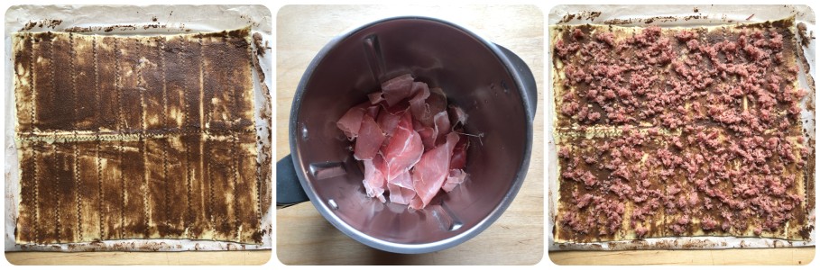 Untar la primera lámina de hojaldre con el paté de aceitunas negras. Triturar finamente el speck en una picadora (yo usé el que viene en lonchas finas) y repartirlo por toda la superficie.