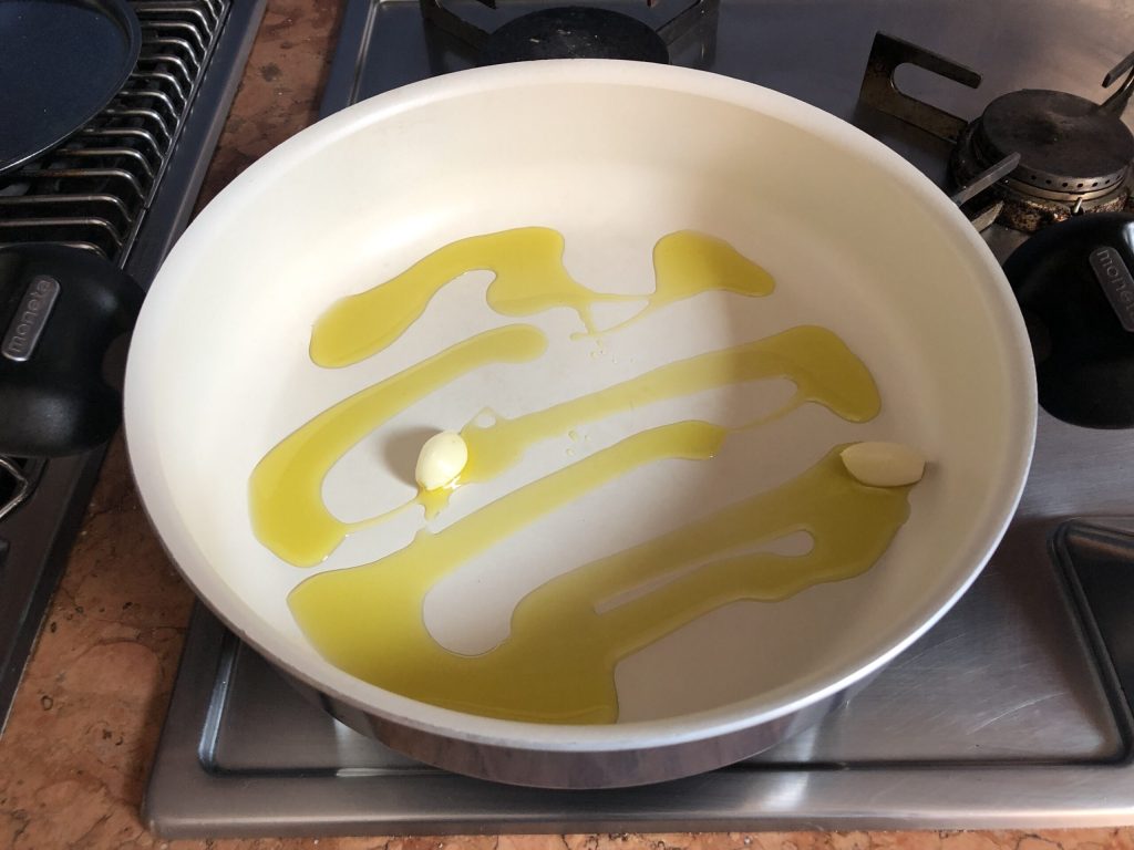 En una cazuela, calentar unas cucharadas de aceite y dorar los dientes de ajo pelados pero enteros.