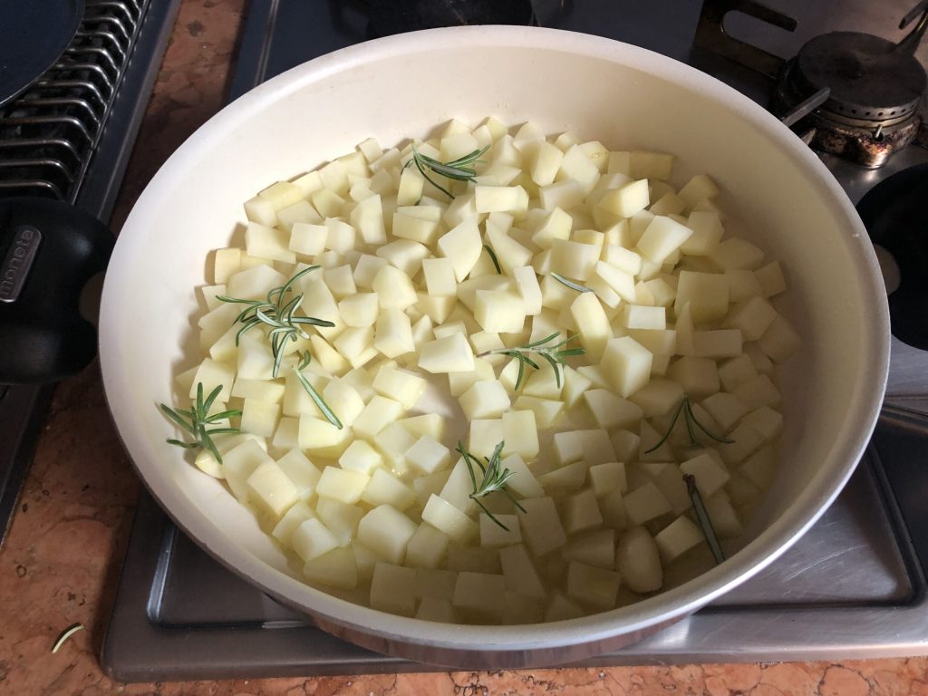 Luego añadir los cubitos de patatas y las hojas de una ramita de romero.
