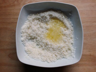 En un bol, mezclar el coco rapé con el azúcar y la harina 00, luego añadir la mantequilla derretida ya fría y mezclarla con la mezcla. Finalmente añadir también la clara de huevo.