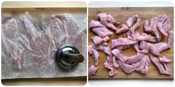Cubrir las rodajas de pechuga de pollo con una hoja de papel de horno y golpear ligeramente con un mazo de carne para afinarlas un poco. Luego cortarlas en tiras.