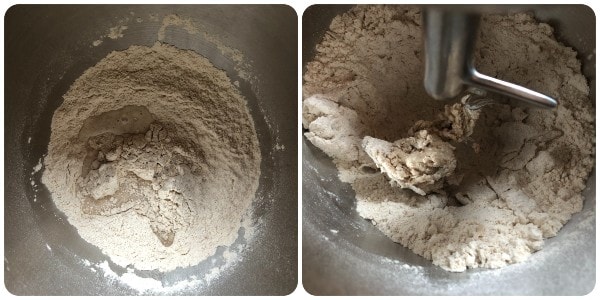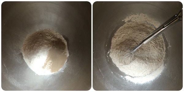 Colocar las dos harinas y la levadura de cerveza seca en el bol de la batidora de pie y mezclar bien con un batidor pequeño de mano.