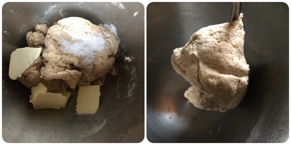 Cuando la masa haya absorbido todos los líquidos, añadir la mantequilla blanda en trozos y la sal y seguir trabajando con el gancho hasta obtener una masa lisa y homogénea.