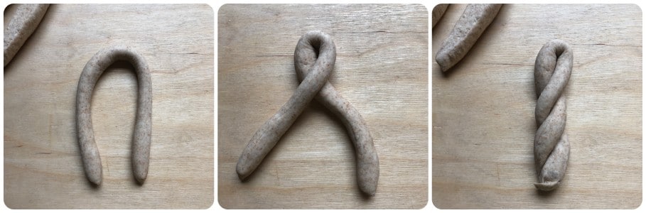 Luego modelar los torcetti como se muestra en las fotos: doblar el rollito a la mitad, enrollarlo y sellar los dos extremos juntos.