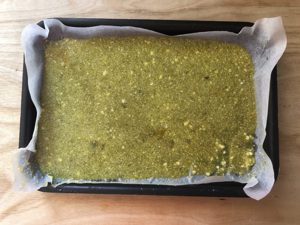 Verter la mezcla obtenida en una bandeja de horno de 30 x 20 cm con bordes bajos.