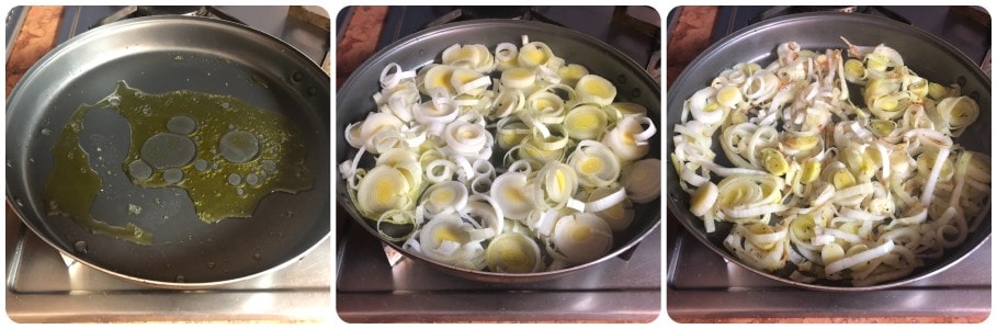 • En una sartén, calentar un par de cucharadas de aceite y un par de agua, luego agregar el puerro, una pizca de sal, una molienda de pimienta negra y cocinarlo hasta que esté bien ablandado. He utilizado una sartén doble para tortillas de 24 cm de diámetro. Si deseáis comprarla, la podéis encontrar en línea haciendo clic AQUÍ.