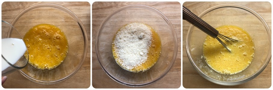 • Mientras tanto, romper los huevos en un cuenco, agregar sal y pimienta al gusto y batirlos con un pequeño batidor de mano solo el tiempo necesario para mezclar yemas y claras.