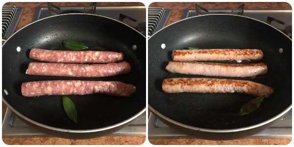 Pincela el fondo de una cacerola con un poco de aceite, añade dos hojas de laurel y calienta ligeramente antes de colocar las 3 piezas de luganega. Dóralas por todos los lados a fuego medio hasta que estén bien doradas: tomará unos 5 minutos. Luego quítalas de la cacerola y resérvalas.
