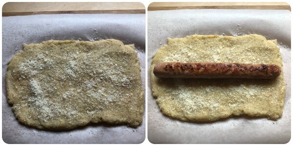 Divide la polenta en tres partes. Distribuye un tercio sobre una hoja de papel de horno, dándole forma de rectángulo ligeramente más largo que la salchicha.