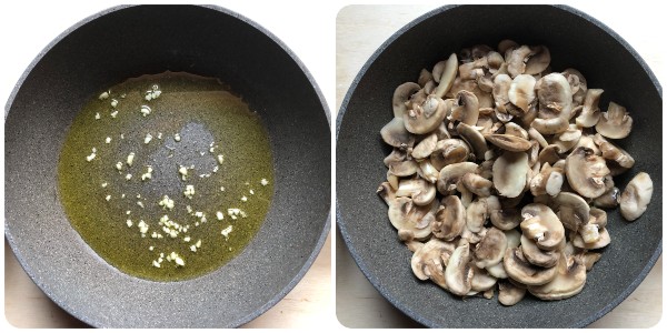 Pelad un diente de ajo, retirad la parte central (el germen), picadlo finamente y sofreídlo en unas cucharadas de aceite dentro de una sartén de tamaño medio (si no os gusta el ajo podéis mantener el diente entero y retirarlo al final de la cocción). Dejadlo chisporrotear un instante y luego añadid los champiñones.