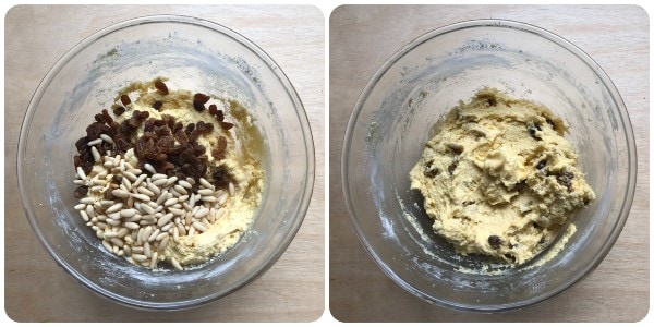 Finalmente, agregar las pasas bien escurridas y los piñones. Os aconsejo reservar un poco de pasas y un poco de piñones para colocarlos en la superficie de las galletas después de darles forma. Mezclar con cuidado para amalgamar perfectamente todos los ingredientes.