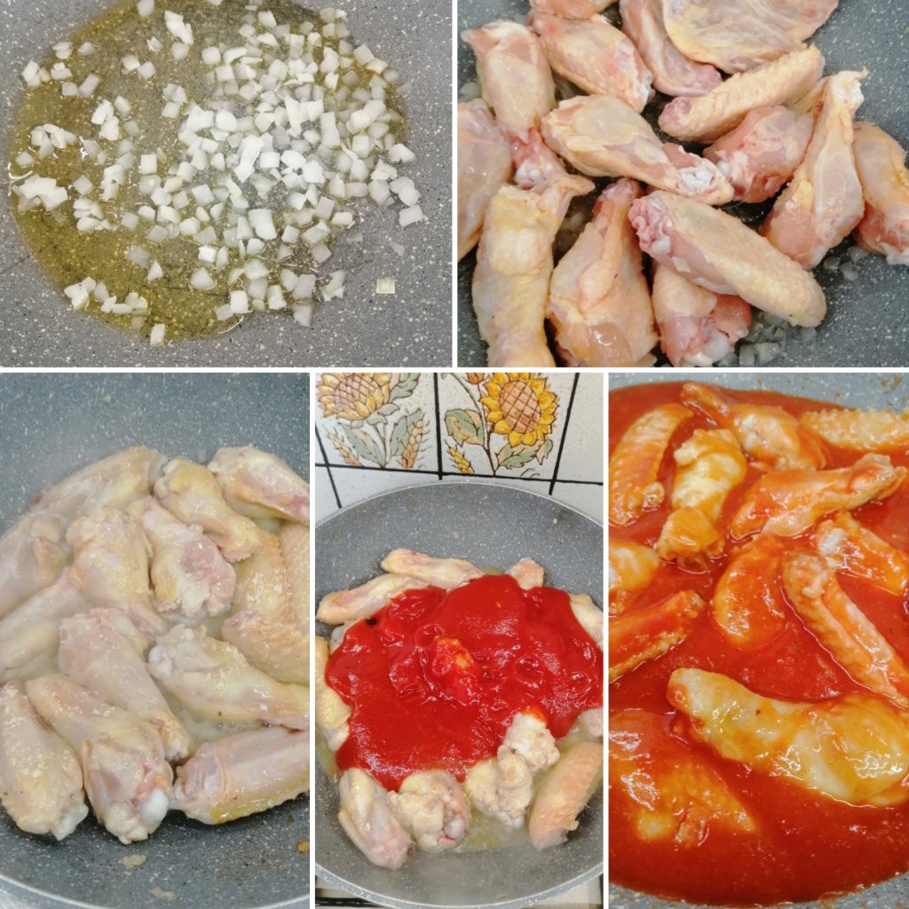 Tomar una sartén de bordes altos y verter un poco de aceite con la cebolla picada y dorar durante 2/3 minutos. A este punto, verter las alitas de pollo y dorarlas a fuego medio durante 5 minutos. Rociar con vino blanco, dejar evaporar, verter el puré de tomate, agregar sal y tabasco (o picante). Mezclar, cubrir con la tapa y cocinar durante 30 minutos a fuego bajo; los últimos 5 minutos de cocción, quitar la tapa y subir el fuego.
